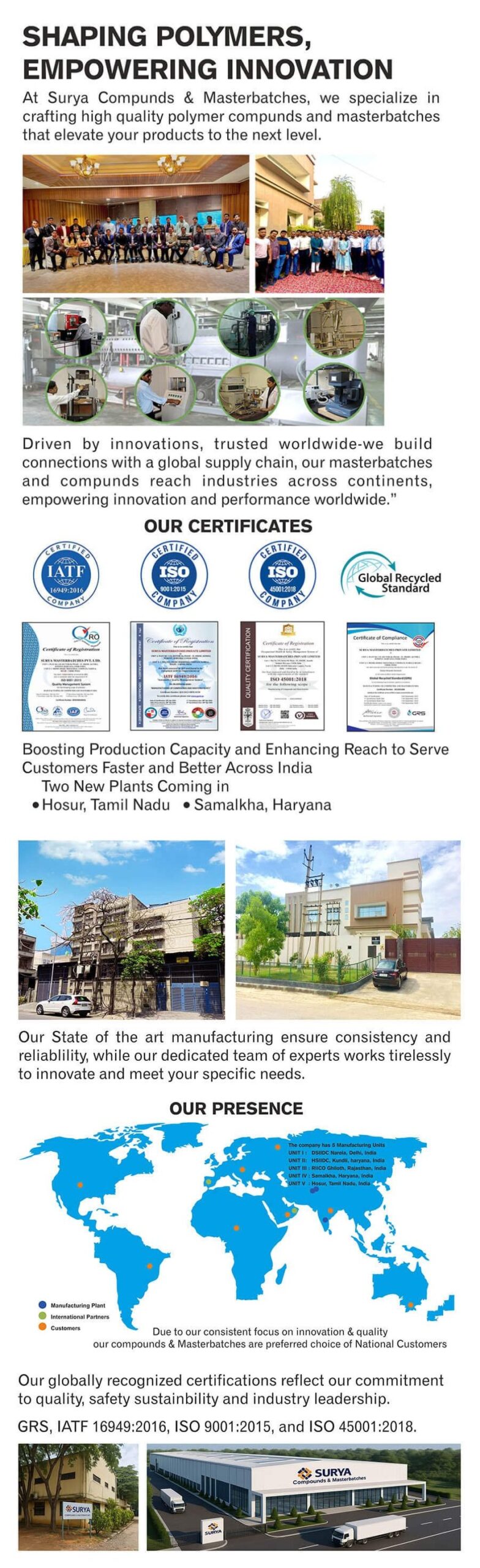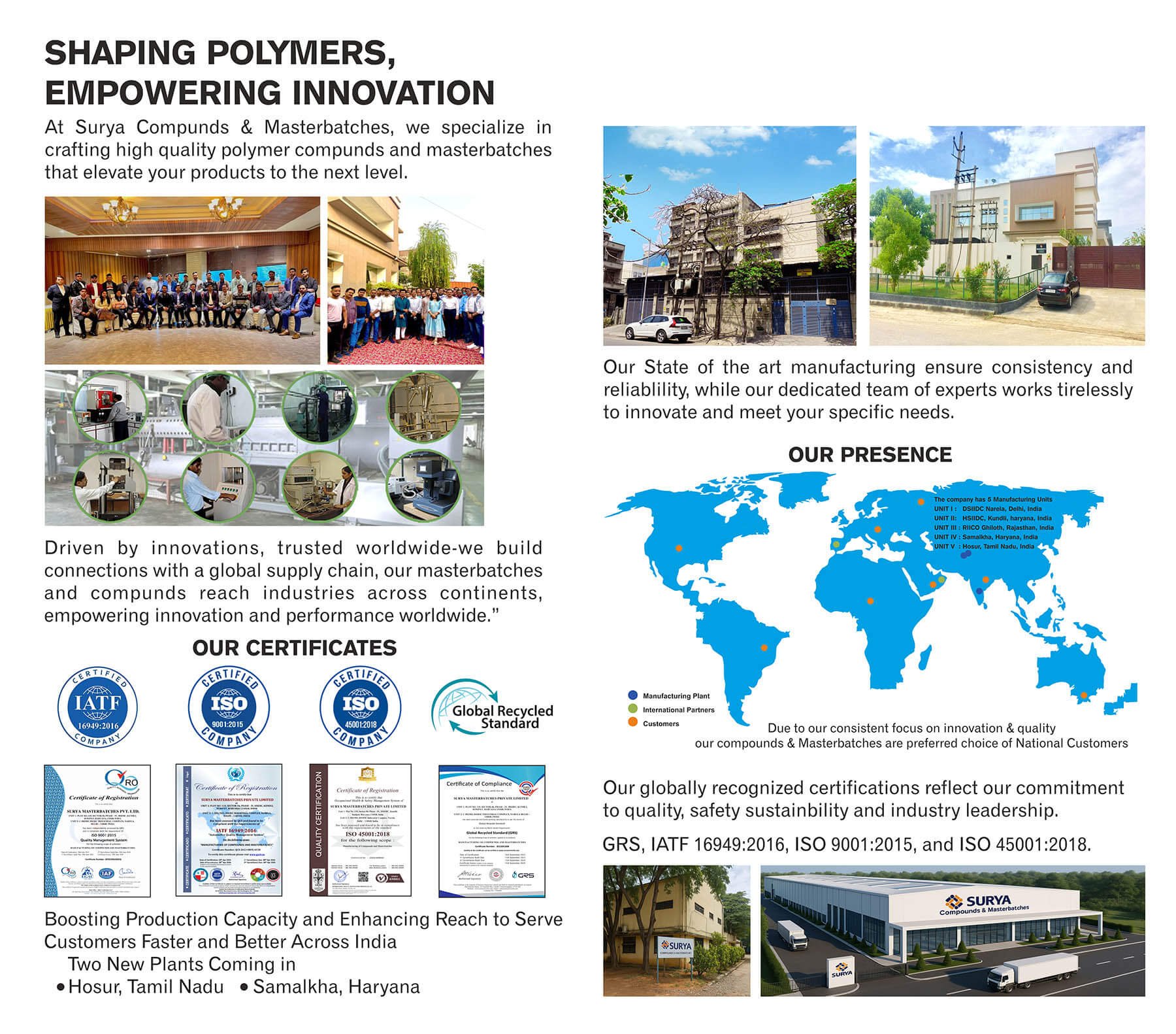 Surya Compounds & Masterbatches, a leading compound manufacturer, blends polymers with additives or fillers to create customized plastic compounds with specific properties such as strength, UV resistance, or flame retardancy.