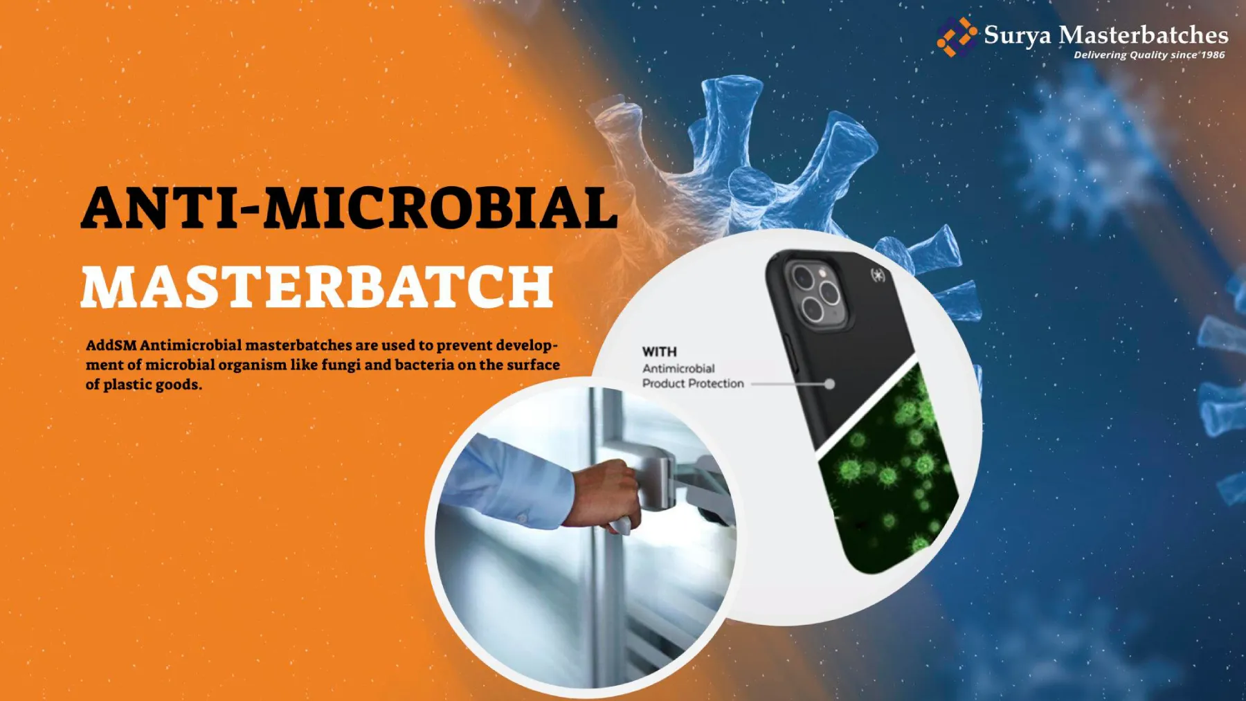 Surya Masterbatches (P) LTD is a Leading Manufacturer and supplier of Anti-Microbial Masterbatch in Delhi, India.AddSM Antimicrobial masterbatches are used to prevent development of microbial organism like fungi and bacteria on the surface of plastic goods. Anti Microbial Masterbatches can be added in the main compound easily during the production process. AddSM is a high efficiency anti-microbial masterbatch ,developed to tackle the rising threat that bacteria present to humans to execute their everyday activities which involves usage of plastic products.